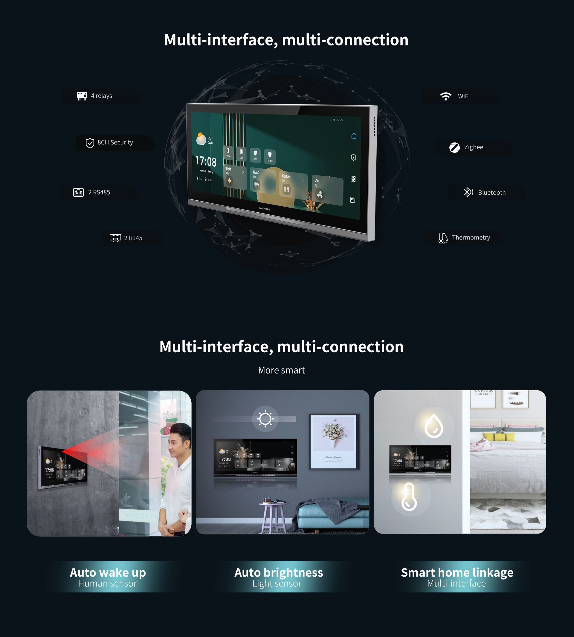 از نظر ارتباطی، پنل علاوه بر پورت شبکه (RJ45 – TCP/IP)، به Wi-Fi، بلوتوث و زیگبی داخلی مجهز است؛ یعنی همزمان میتواند نقش مرکز کنترل، گیتوی زیگبی و پنل تصویری داخلی را بازی کند. وجود ورودیهای آلارم سیمی (8 کانال) نیز این امکان را میدهد تا سنسورهای امنیتی و حفاظتی سنتی را به سادگی با سیستم هوشمند ترکیب کنید.